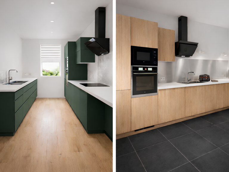 Ensuite, nous réalisons les étapes de transformation : murs et plafonds, revêtements de sol (carrelage ou parquet), ajustements techniques (prises, éclairages, arrivées/évacuations), puis finitions soignées pour une cuisine moderne, bien organisée et prête à l’usage.