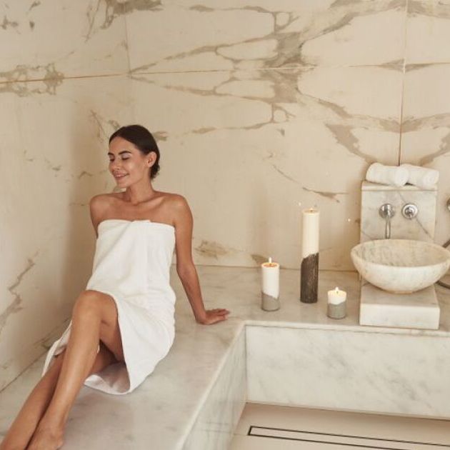 Assise tranquillement, elle profite de son petit hammam privé, imaginé sur mesure pour s’adapter parfaitement à la pièce et à ses habitudes. L’objectif : un lieu pratique, facile à entretenir, mais surtout agréable à vivre au quotidien. Entre la chaleur enveloppante, les matériaux élégants et les détails bien pensés (vasque, robinetterie, zone de repos), cet espace devient un vrai rituel : quelques minutes suffisent pour relâcher la pression et retrouver de l’énergie.